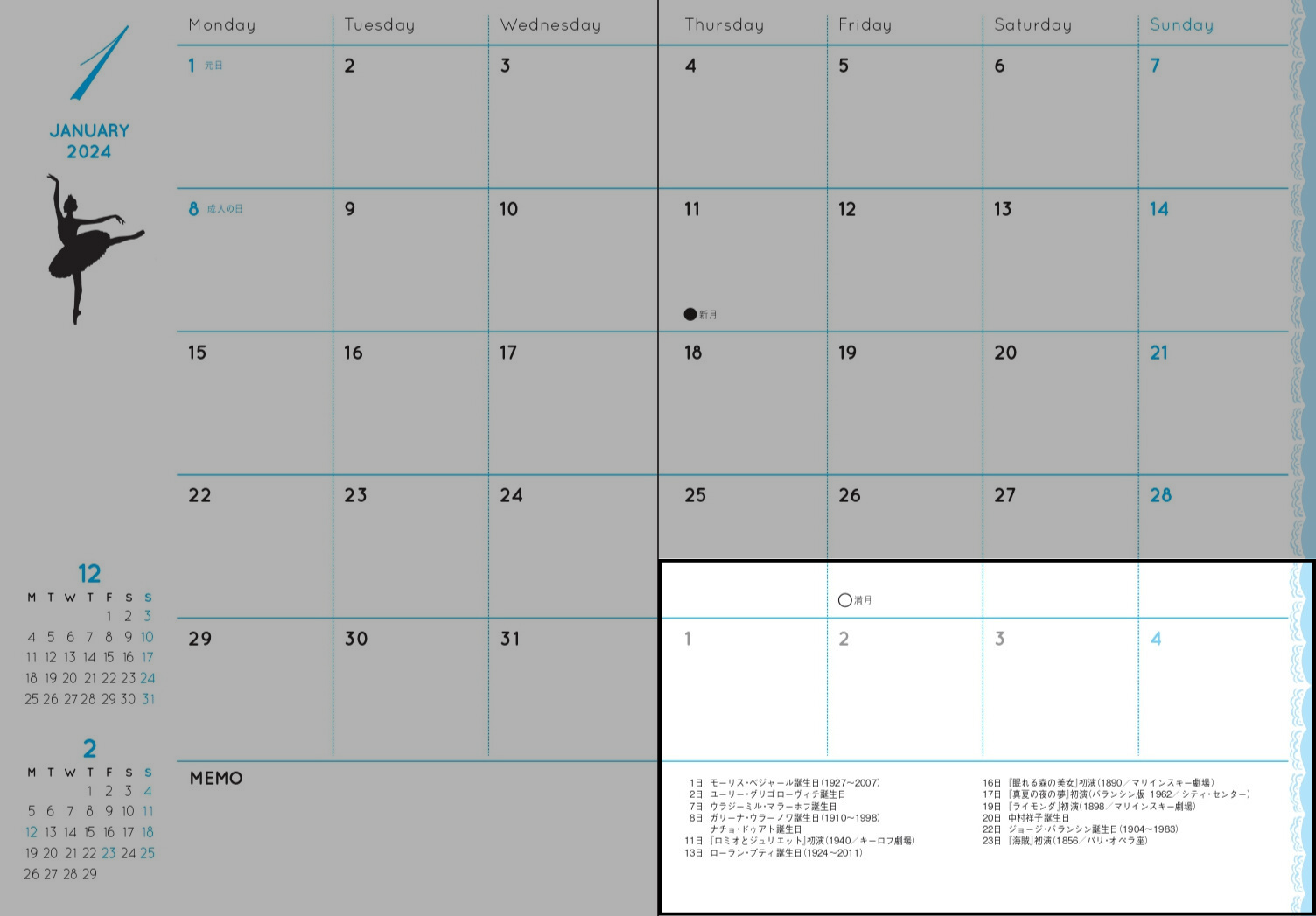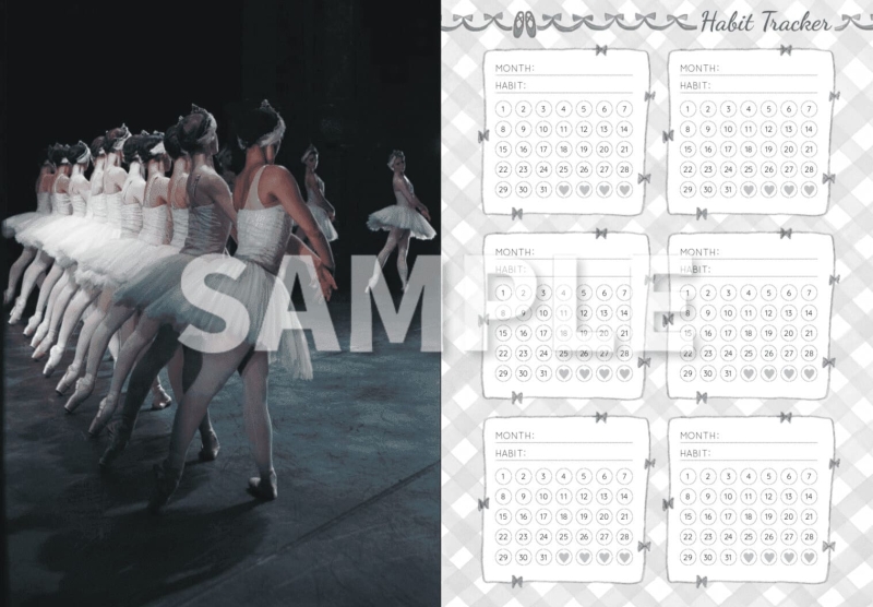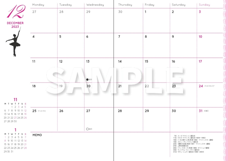 マンスリーページにはバレエのシルエット×14 載せています。 月毎にかわるのが、たのしい☆ どの作品のシーンなのか、すべてわかるあなたはかなりのバレエ通です!