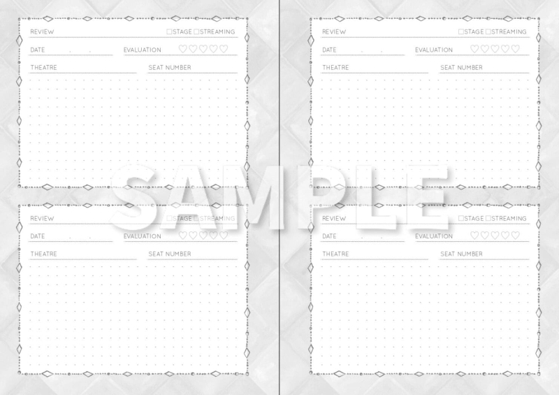 ステージの感動は、人生を豊かにしてくれるもの。 心が動いたとき、その内容をぜひ書き残してください。 お気に入りのシーンやキャストなど、見返すたびに幸せな気持ちがよみがえるかも。 劇場名や席番も書き込めます◎ 会場別・席種別での見え方の違いのメモとしてもぜひご活用ください。