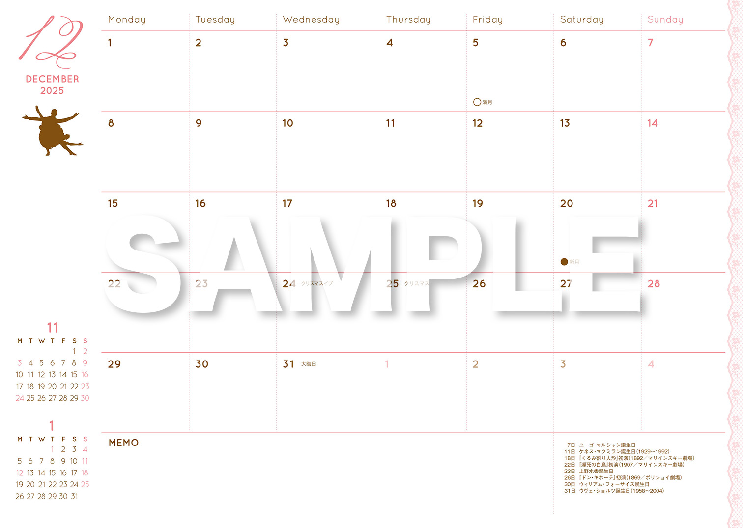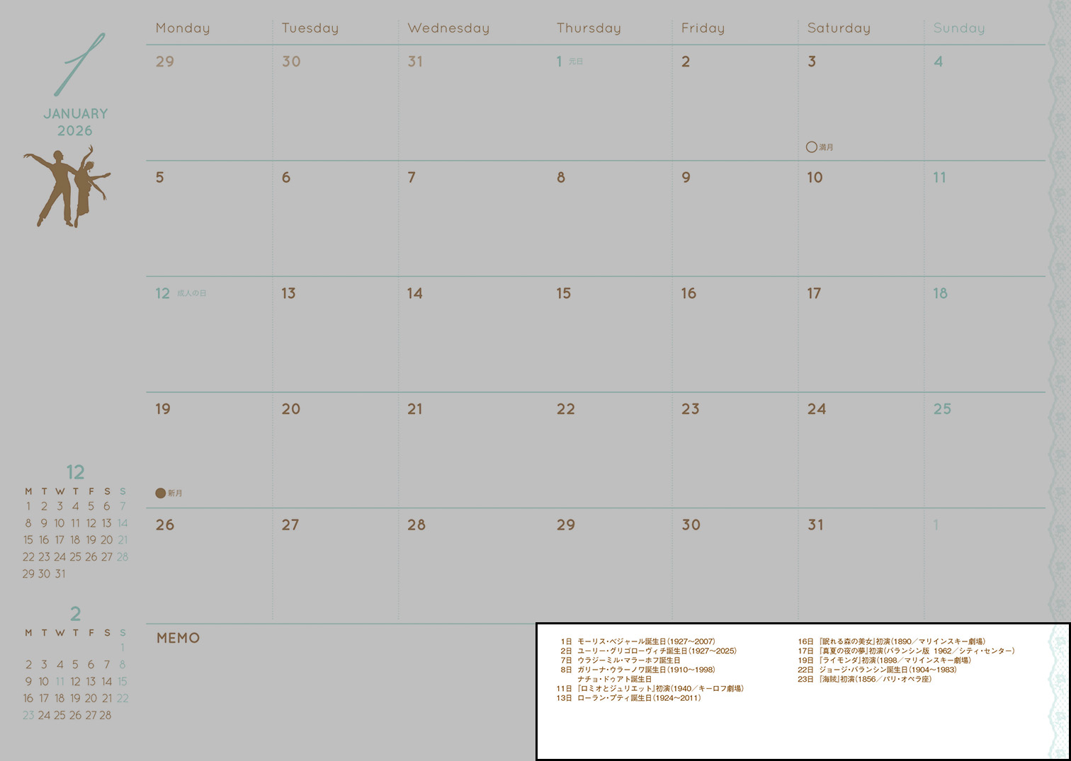 マンスリーページにはバレエのシルエット×14 載せています。 月毎にかわるのが、たのしい☆ どの作品のシーンなのか、すべてわかるあなたはかなりのバレエ通です!